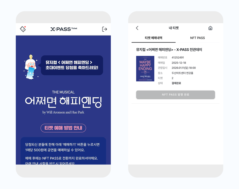 - 공연 당일 매표소에서 NFT PASS 및 당첨자 정보를 확인하고 실물 티켓을 전달드립니다. (매표소 운영시간: 1/11(일) 16:30 ~18:00)
