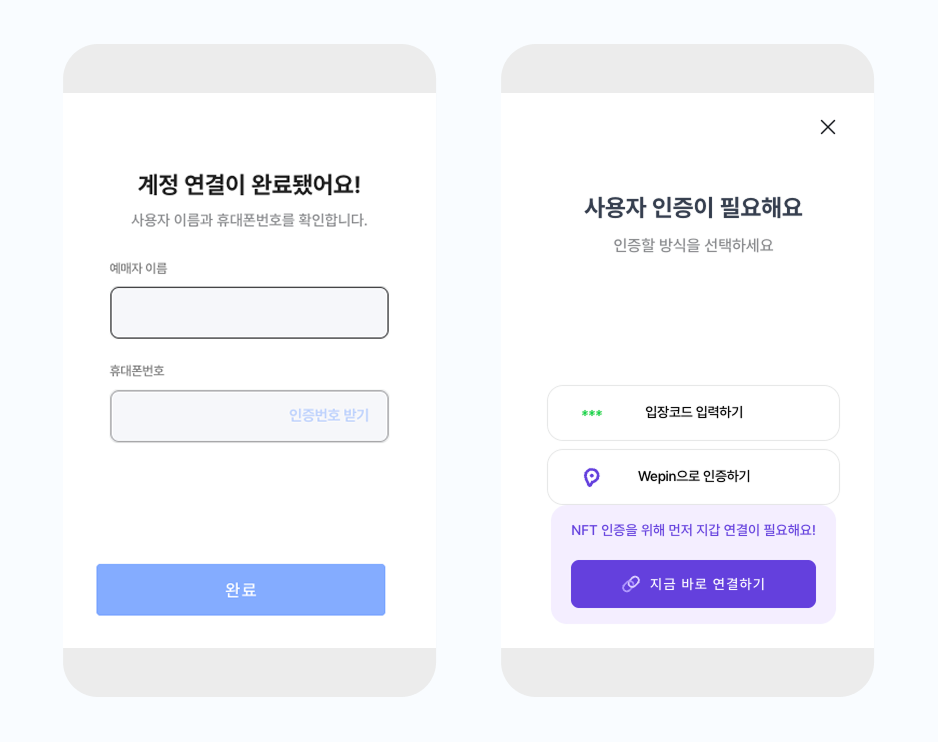 - 시크릿 예매 페이지 소셜 로그인, 위핀 지갑 연결, 최소 금액 결제(1매 500원)가 필요합니다.