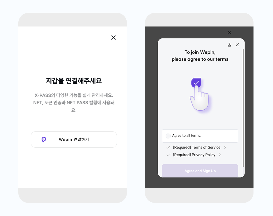 위핀 약관에 동의하고, 6-8자리의 핀 암호를 설정합니다. 위핀 지갑을 완료했다면 문자로 받은 입장코드를 입력합니다.