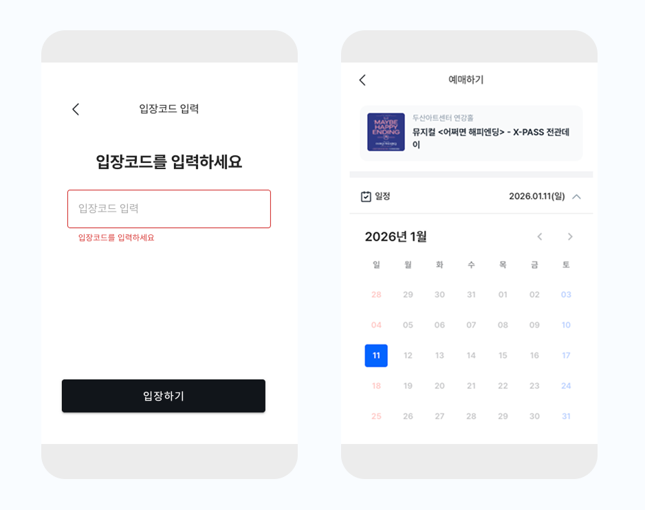 입장코드를 입력하면 뮤지컬 <어쩌면 해피엔딩>을 예매할 수 있습니다. 공연 일정은 26년 1월 11일 오후 6시만 선택 가능합니다.
