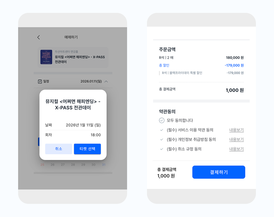 최소 결제 금액인 1매 당 500원을 결제해 주세요. 인당 최대 2매까지 예매할 수 있습니다. 그 이후 추가 예매하시는 경우 예약이 완료되지 않습니다.