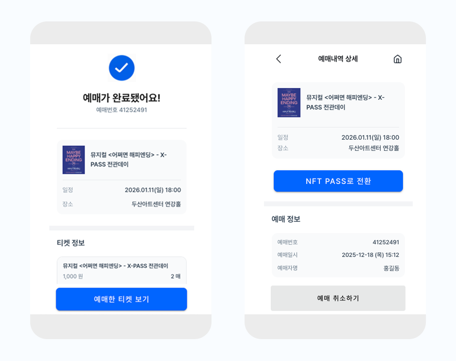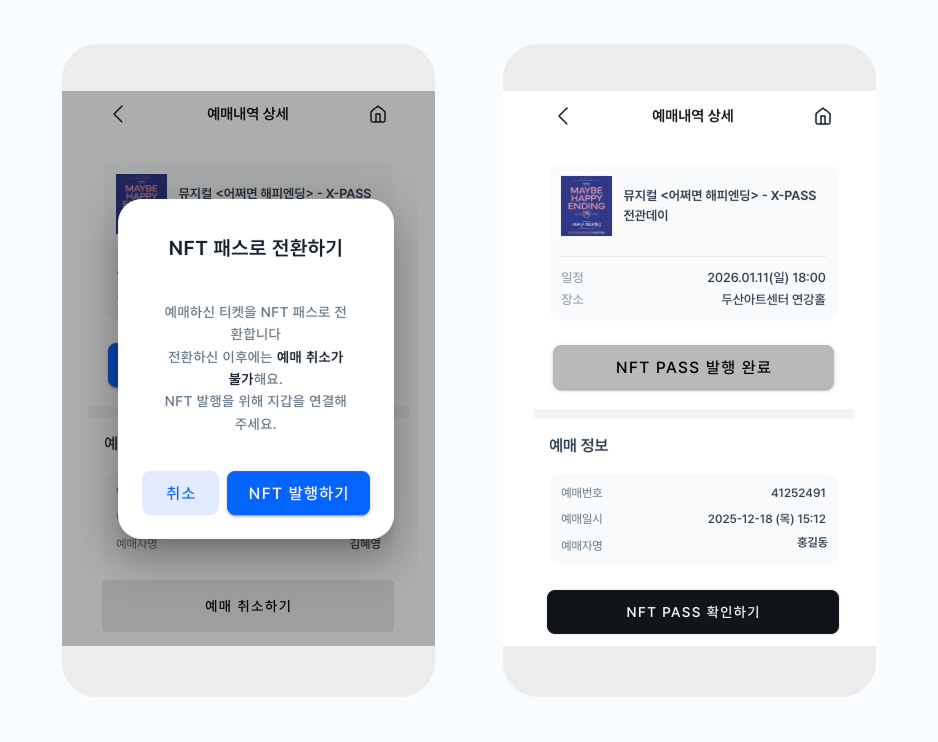 NFT를 발행하면 취소가 불가능합니다. 일정상의 문제로 관람이 불가능한 경우, NFT 패스로 전환하기 전에 취소 부탁드립니다.