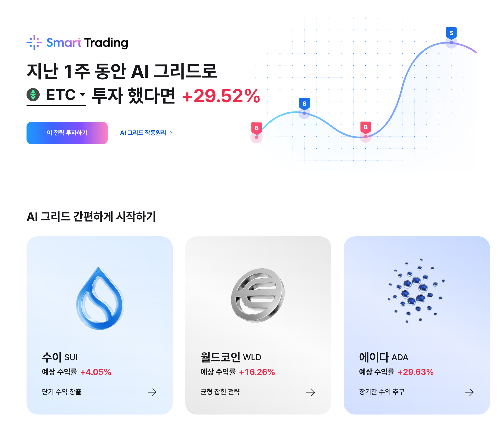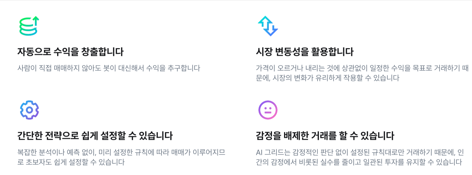 자동 매매 프로그램 혹은 일종의 투자 봇이라고 할 수 있습니다. AI 그리드는 자산의 가격이 설정된 가격 범위에서 하락하면 매수 주문을 하고 가격이 다시 오르면 매도 주문을 실행하여 수익을 얻습니다. 즉, 변동성이 큰 시장에서 낮은 가격에 매수하고 높은 가격에 매도하며 계속 수익을 창출하는 전략입니다.