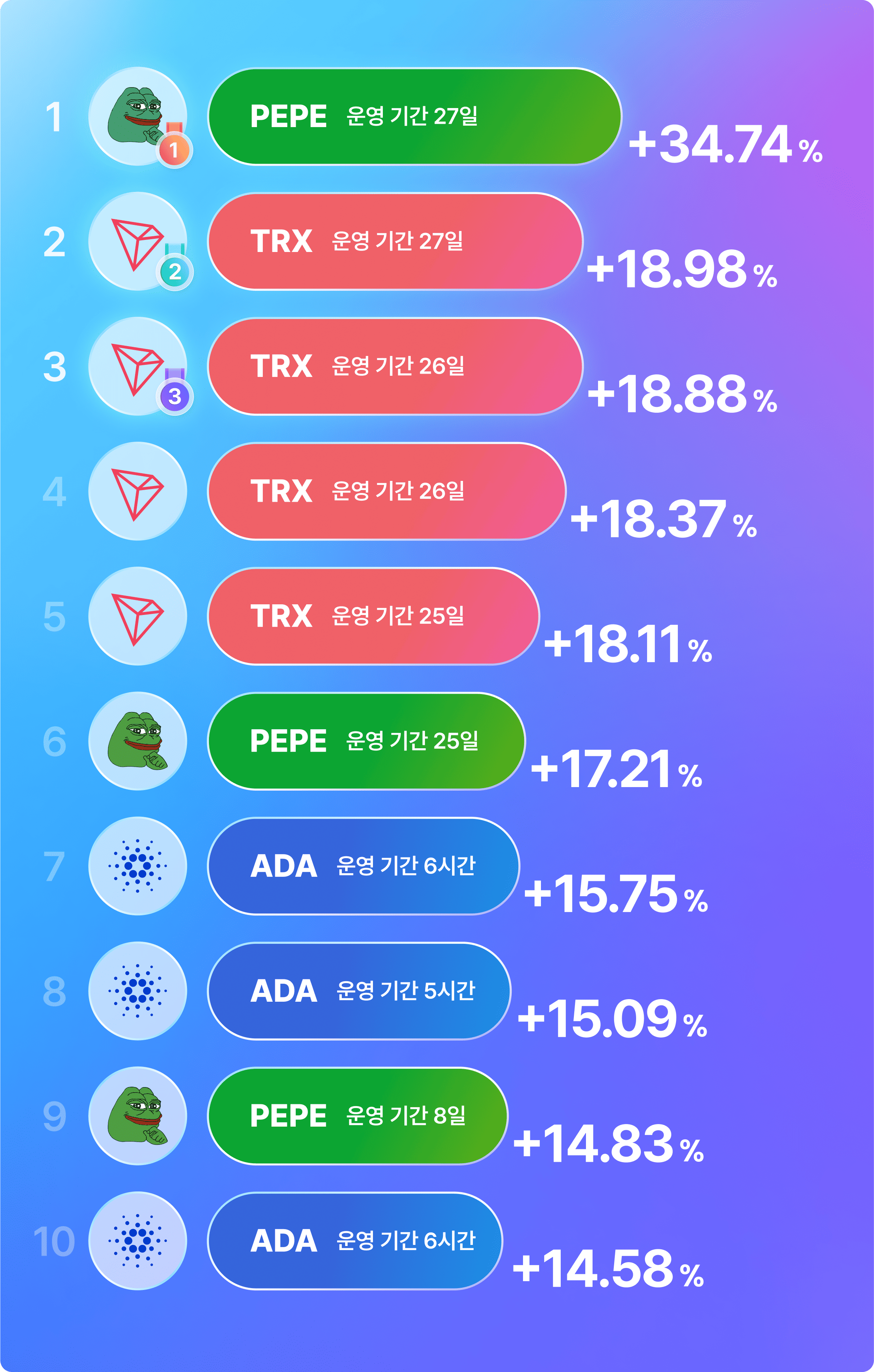 AI 그리드를 활용하는 사용자들 중, 실제로 우수한 수익 성과를 기록한 사례를 소개해 드리겠습니다. 다음은 2025년 4월 7일 오후 11시 59분 기준으로 높은 수익률*을 기록한 AI 그리드 운영 현황입니다.