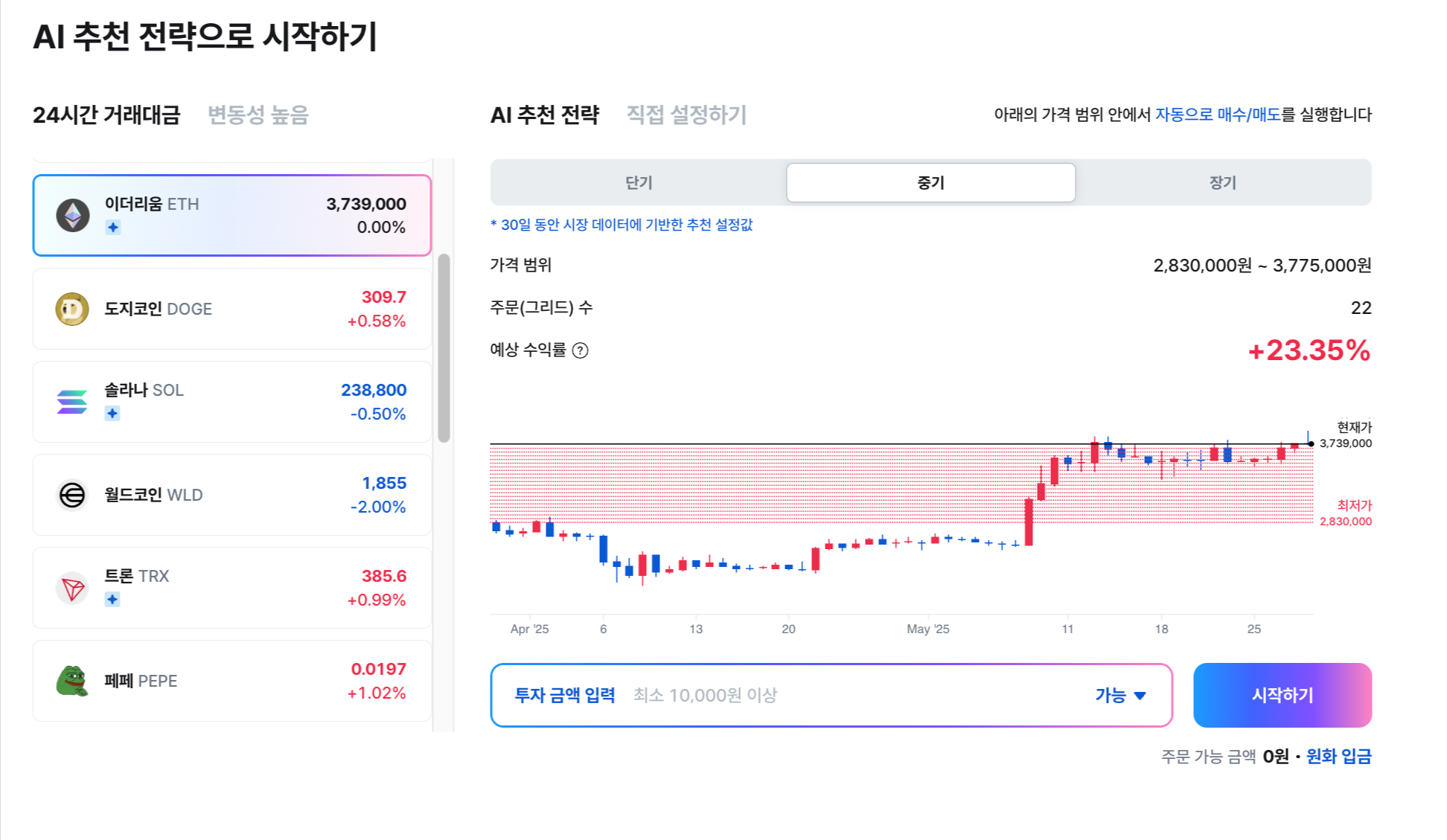 종목과 전략(단기/중기/장기)을 선택하면, 시장 데이터를 기반으로 자동 설정이 적용되어 투자금만 입력하면 쉽게 그리드 설정이 완료됩니다. 단, 이는 과거 데이터를 참고한 추천 값이므로 본인의 투자 성향과 시장 상황에 맞게 조정이 필요합니다.